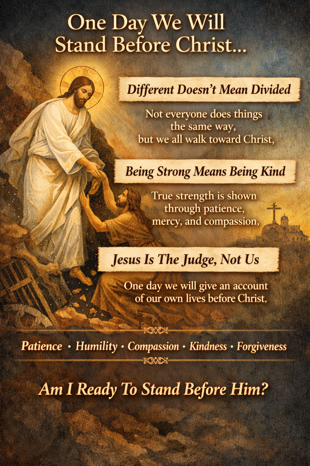 If God sees something wrong in a person’s behavior, then it is God who must work upon that person’s heart, not us. It is not our task; it is above our pay grade. That leads to the second question: when I disagree with another Christian, do I react with pride or with patience? If someone shares something that seems completely wrong to us, or holds an opinion that we find surprising for a Christian, we must be very careful. It is not ours to correct in a spirit of judgment or superiority. Rather, we must allow God to work in that person’s life. Indeed, it may even be that they are right and we are wrong. For that reason, patience must always guide our response to others. Then there is the third question: if I truly remembered that one day I will stand before Jesus Christ, what would I change about the way I treat others? That is a sobering thought. Imagine going to sleep tonight and, at three o’clock in the morning, Christ returns. Suddenly, we are standing before Him, giving an account of our lives. Would there be moments we would regret—times when we could have shown more kindness, more compassion, more courtesy, more humility, more gentleness? These are the things we should reflect upon as we consider this passage.
